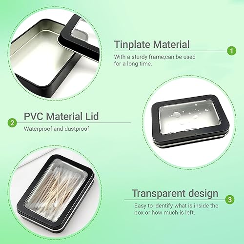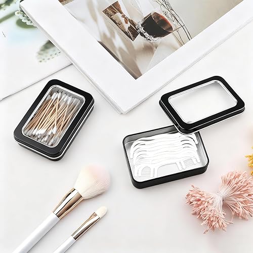 • Quantity & Sizes: This package includes 2pcs of metal storage box with lid, each measuring 3.42x2.63x0.8 inch and featuring a full black window design—this compact size is perfect for small-item storage without taking up too much space, while the 2-box set provides extra capacity for separating different items, making them practical as travel cotton swab holder and small dental floss holder for daily or on-the-go use