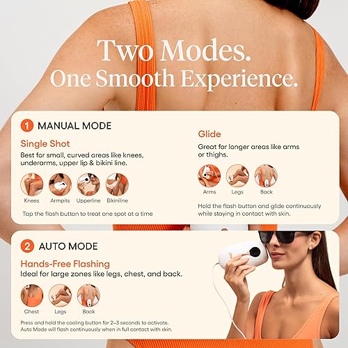 Precision and Power with Dual Modes: The Mini Pro IPL offers Auto Mode, which automatically fires the flash bulb continuously as long as the light window is in contact with the skin, making it perfect for large areas like legs, chest, and back; Switching to Manual Mode gives you full control with options like Single Shot for targeted, precise flashes on smaller or curved areas, and Glide Mode, where you can glide the device across larger areas for continuous flashes