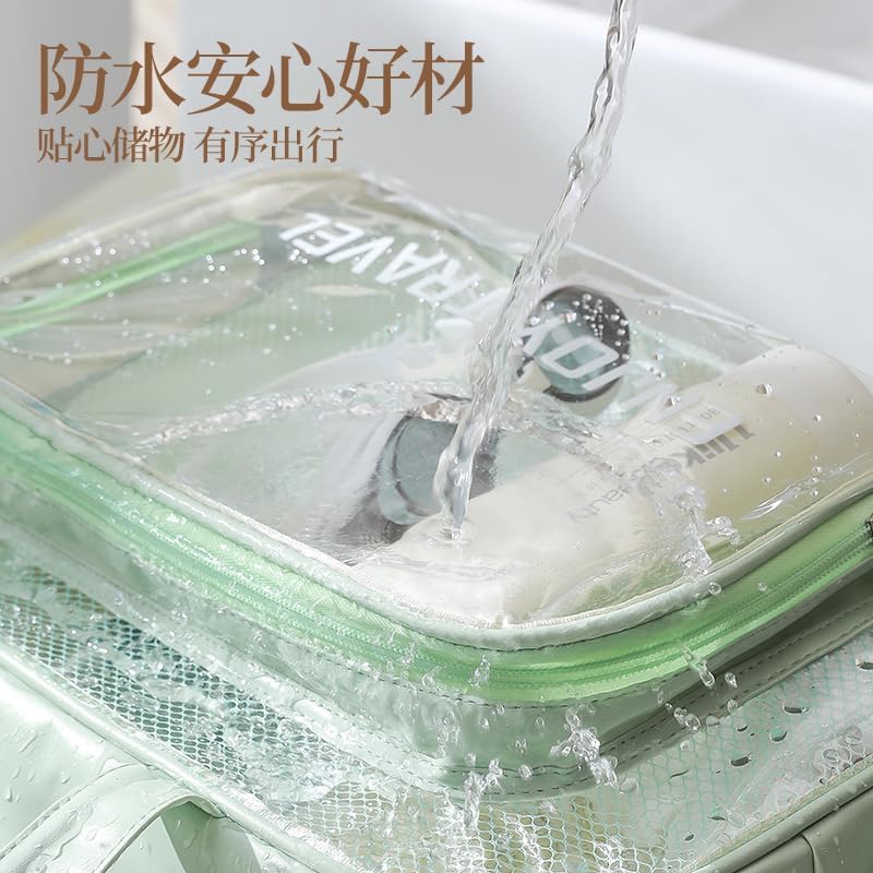 VERSATILE DESIGN: Large capacity clear mesh toiletry bag with mint green trim features separate compartments for dry items, wet items, and shoes for organized travel storage
